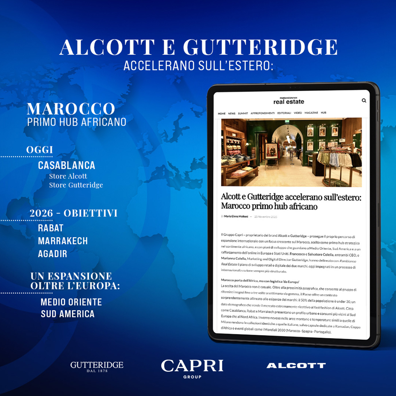 La presenza è già concreta: a Casablanca sono attivi diversi store Alcott e un store Gutteridge, e il 6 dicembre è prevista una nuova apertura Alcott