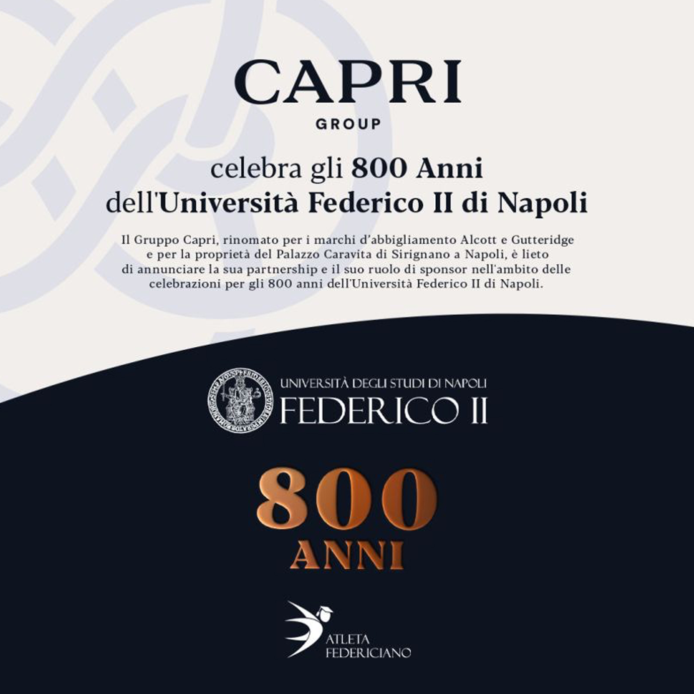Il GruppoCapri, rinomato per i marchi d’abbigliamento ALCOTT e Gutteridge 1878 e per la proprietà del Palazzo Caravita di Sirignano a Napoli, è lieto di annunciare la sua partnership e il suo ruolo di sponsor nell'ambito delle celebrazioni per gli 800 anni dell'Università degli Studi di Napoli Federico II. "Per noi è motivo di orgoglio partecipare alla celebrazione di uno dei più antichi atenei d'Europa, nonché istituzione universitaria simbolica per la nostra Napoli", hanno dichiarato Nunzio Colella e Anna Sorrentino Colella, fondatori del Gruppo Capri. “Università degli Studi di Napoli Federico II è un'icona di conoscenza e cultura nel panorama accademico mondiale ed il Gruppo Capri è onorato di poter contribuire a rendere ancora più memorabile questo storico anniversario, celebrando le eccellenze della nostra città." In qualità di sponsor della ricorrenza, il Gruppo Capri sarà protagonista attraverso i loghi di Alcott e Gutteridge sulle divise degli atleti che parteciperanno alle competizioni sportive organizzate per l'occasione. Inoltre, il Gruppo si farà carico della produzione di divise casual appositamente create per gli atleti, che rappresentino lo spirito di innovazione ed eccellenza dei due marchi.
